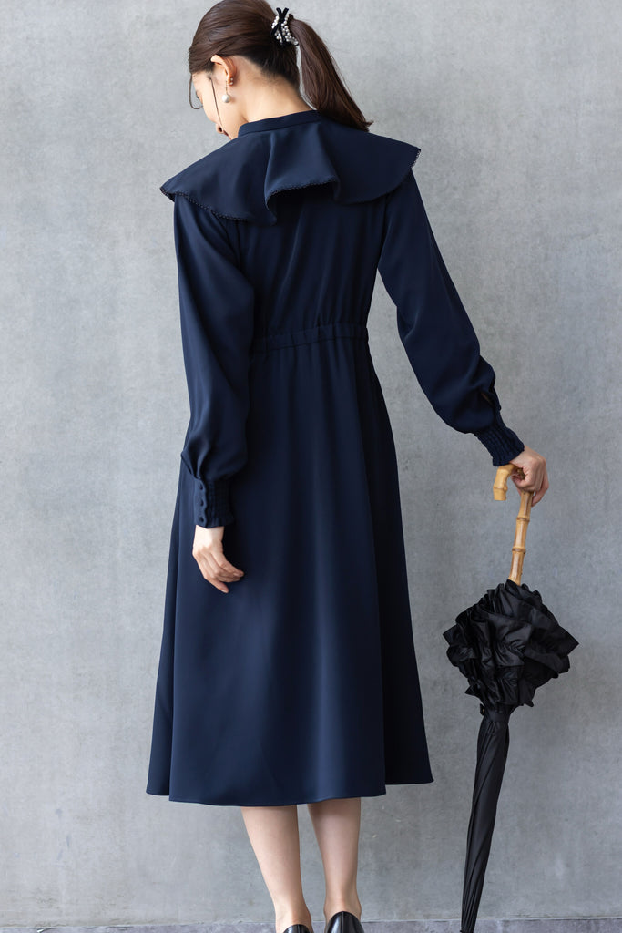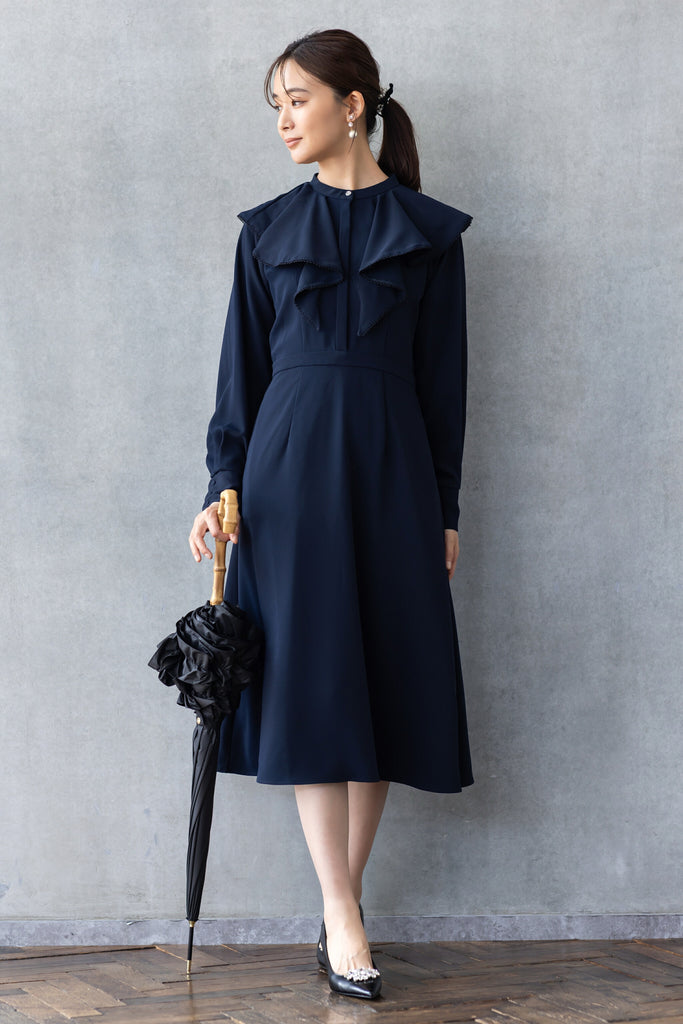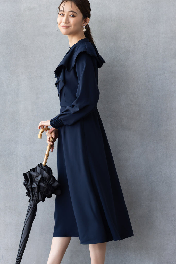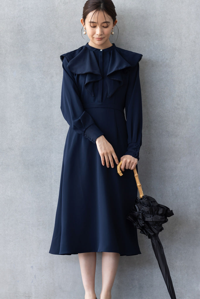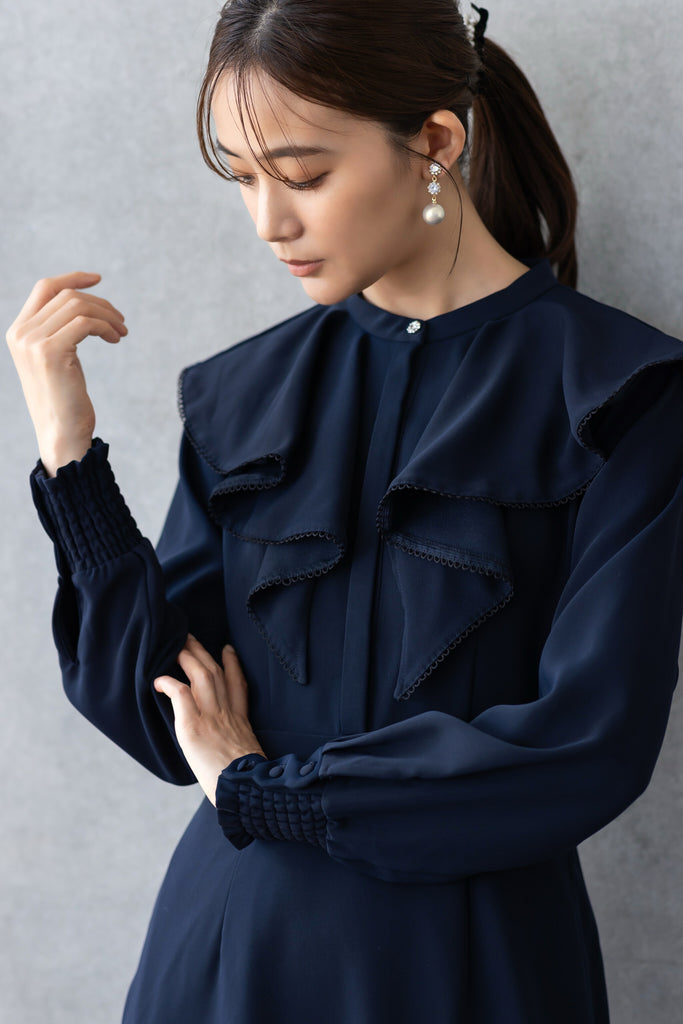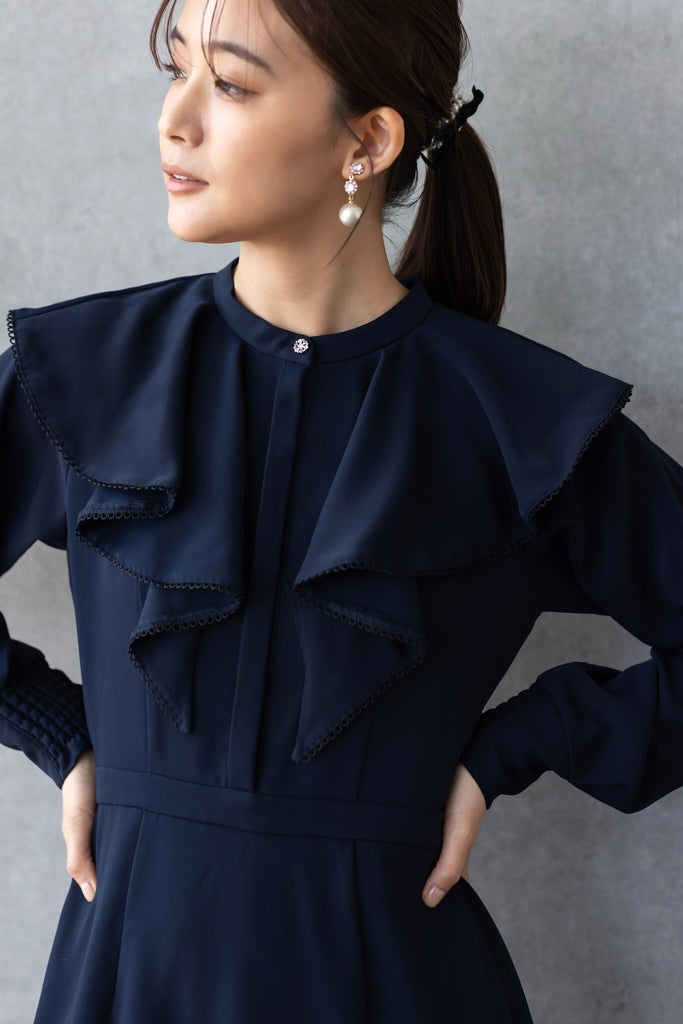 お顔周りを華やかに盛り上げるラッフルカラーが主役のワンピース。