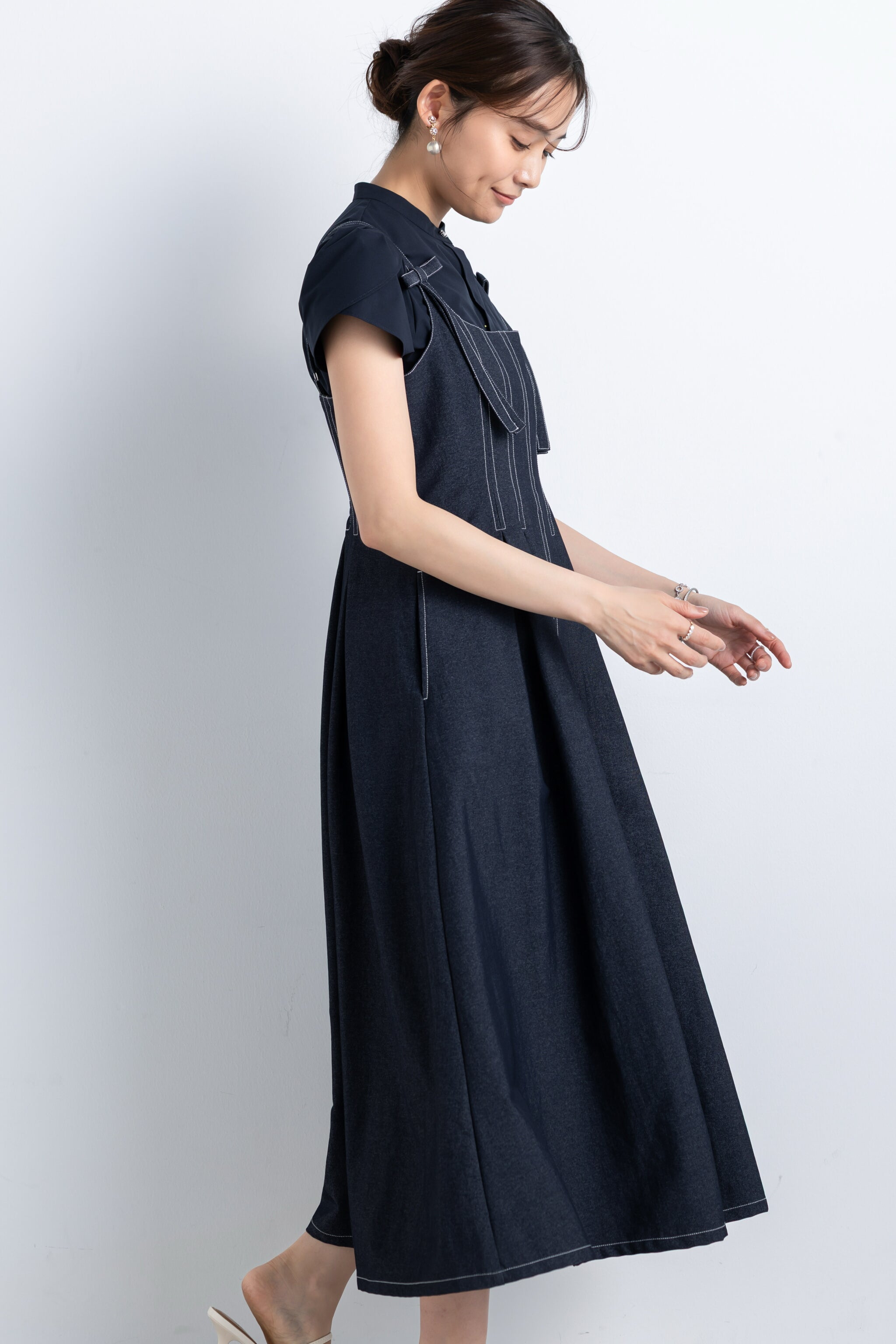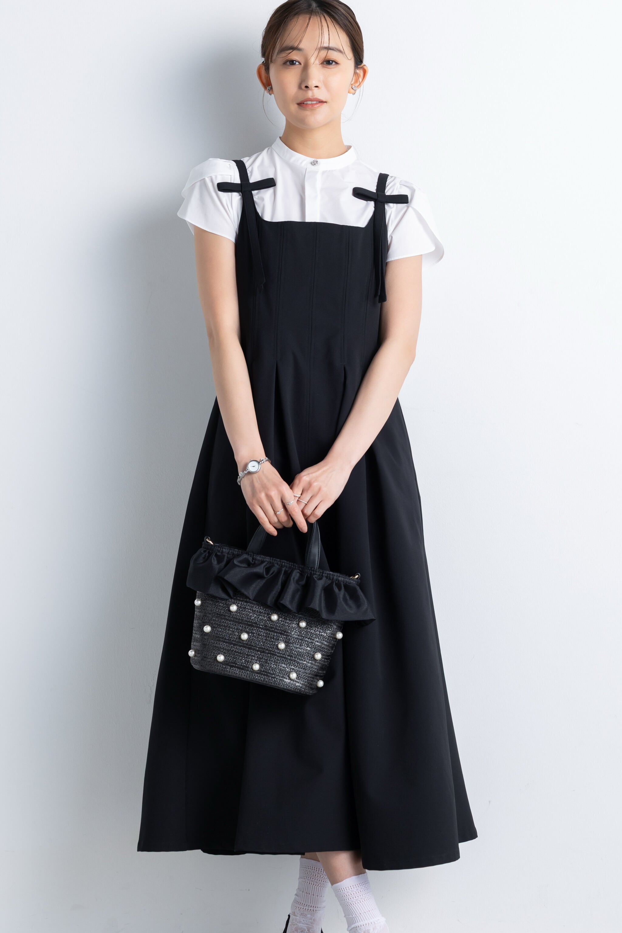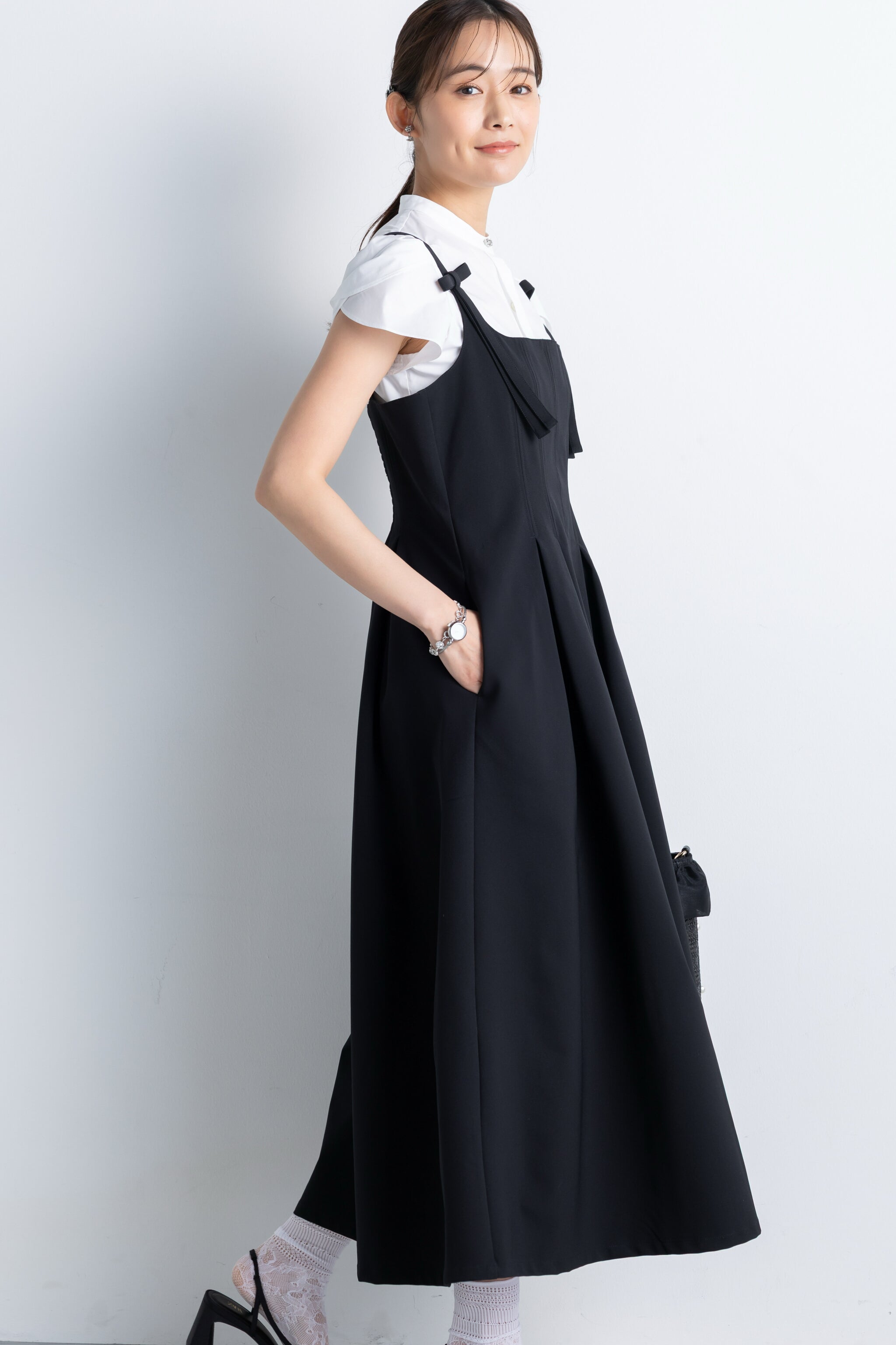 美しいフレアシルエットにリボンを添えて、大人に似合う可愛さを追求したキャミドレス。