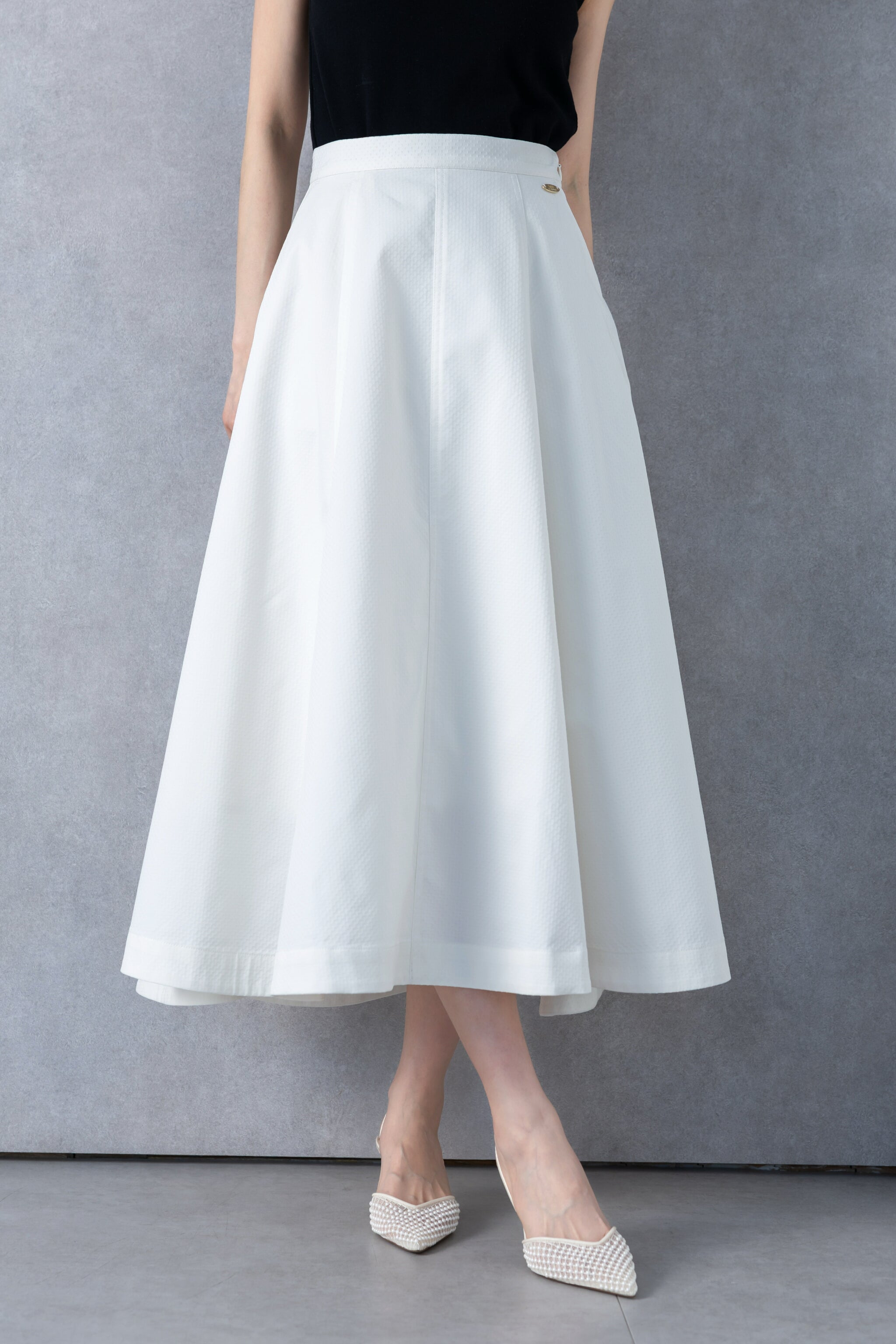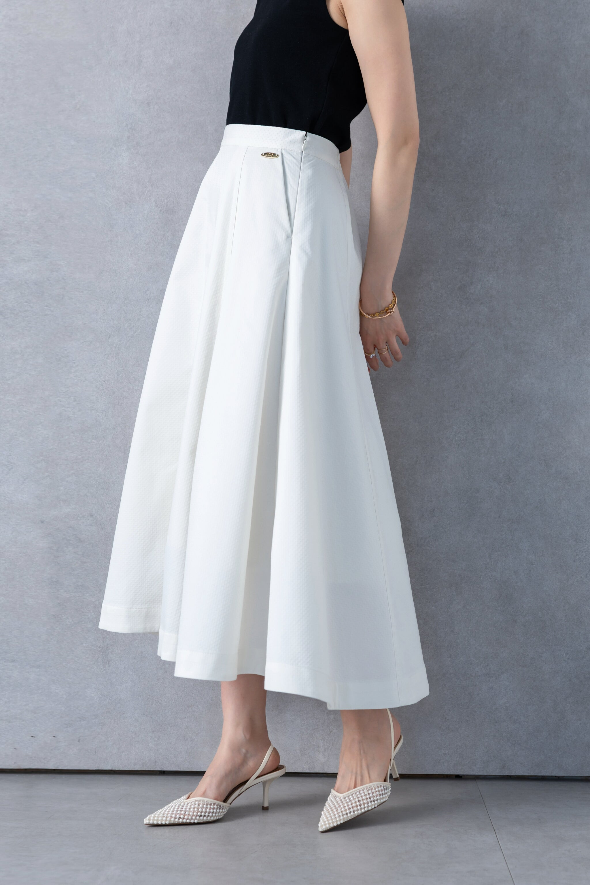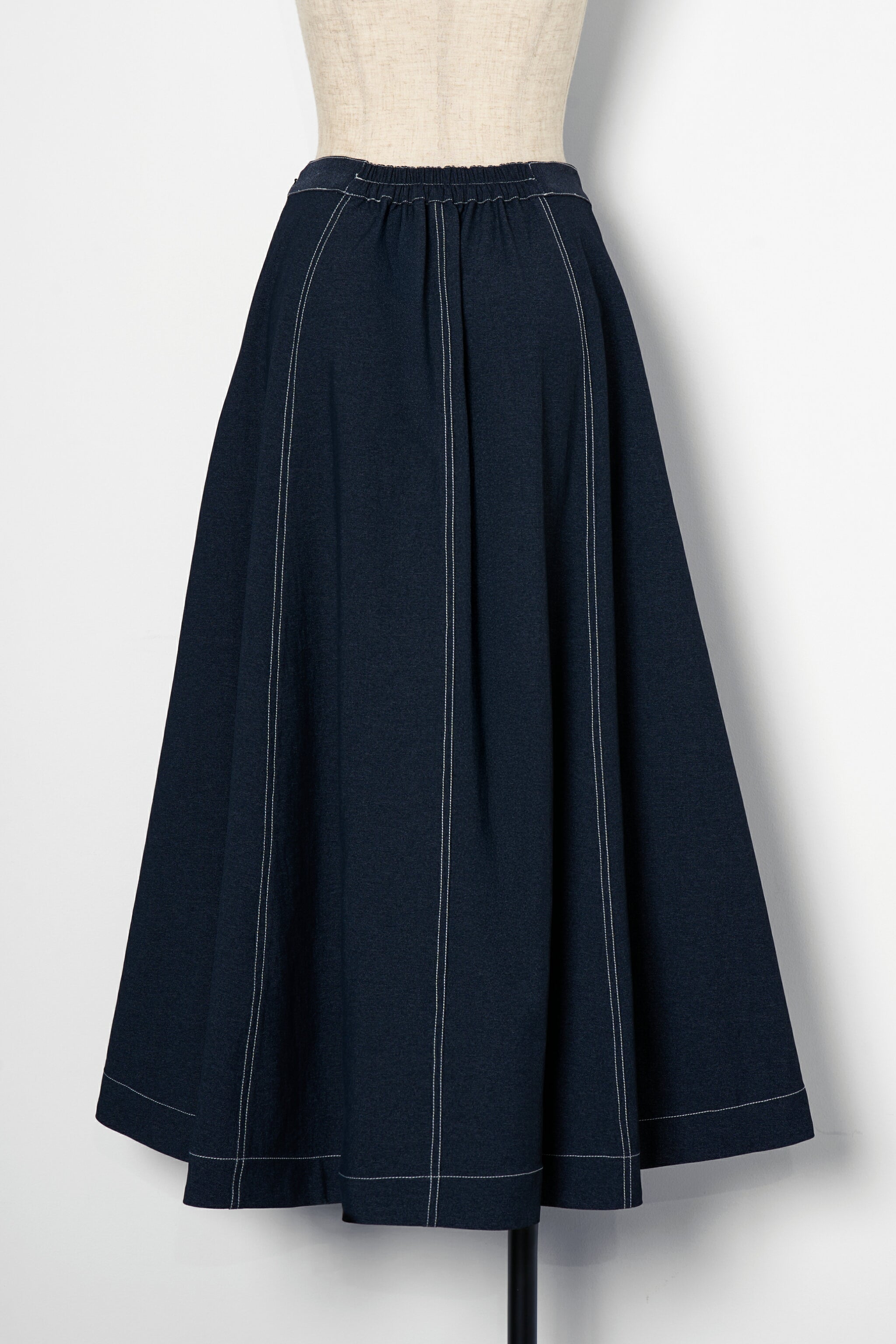 たっぷりとパネル切替を入れ、さらに後ろにかけて流れるように⾧くすることで、裾まわりに美しいフレアを形成したスカート。