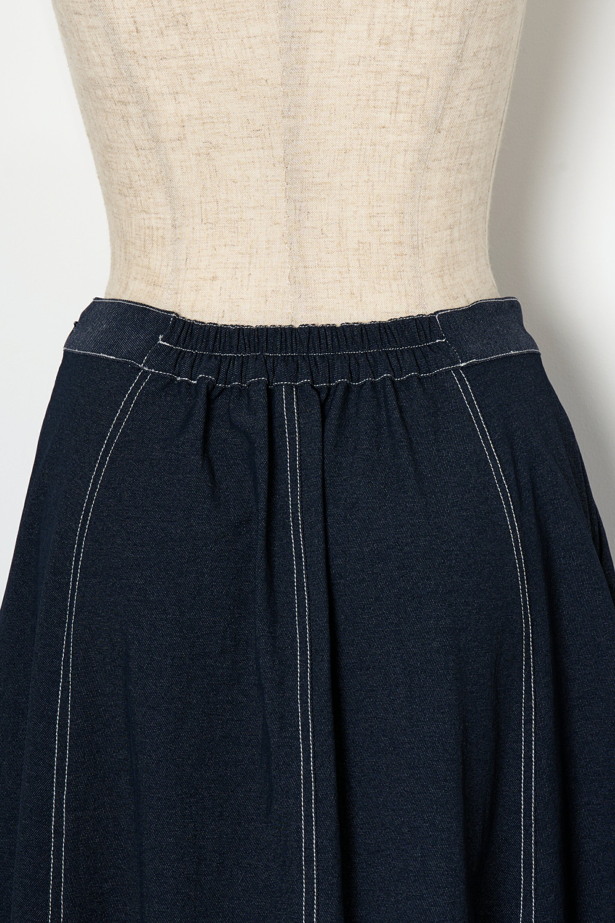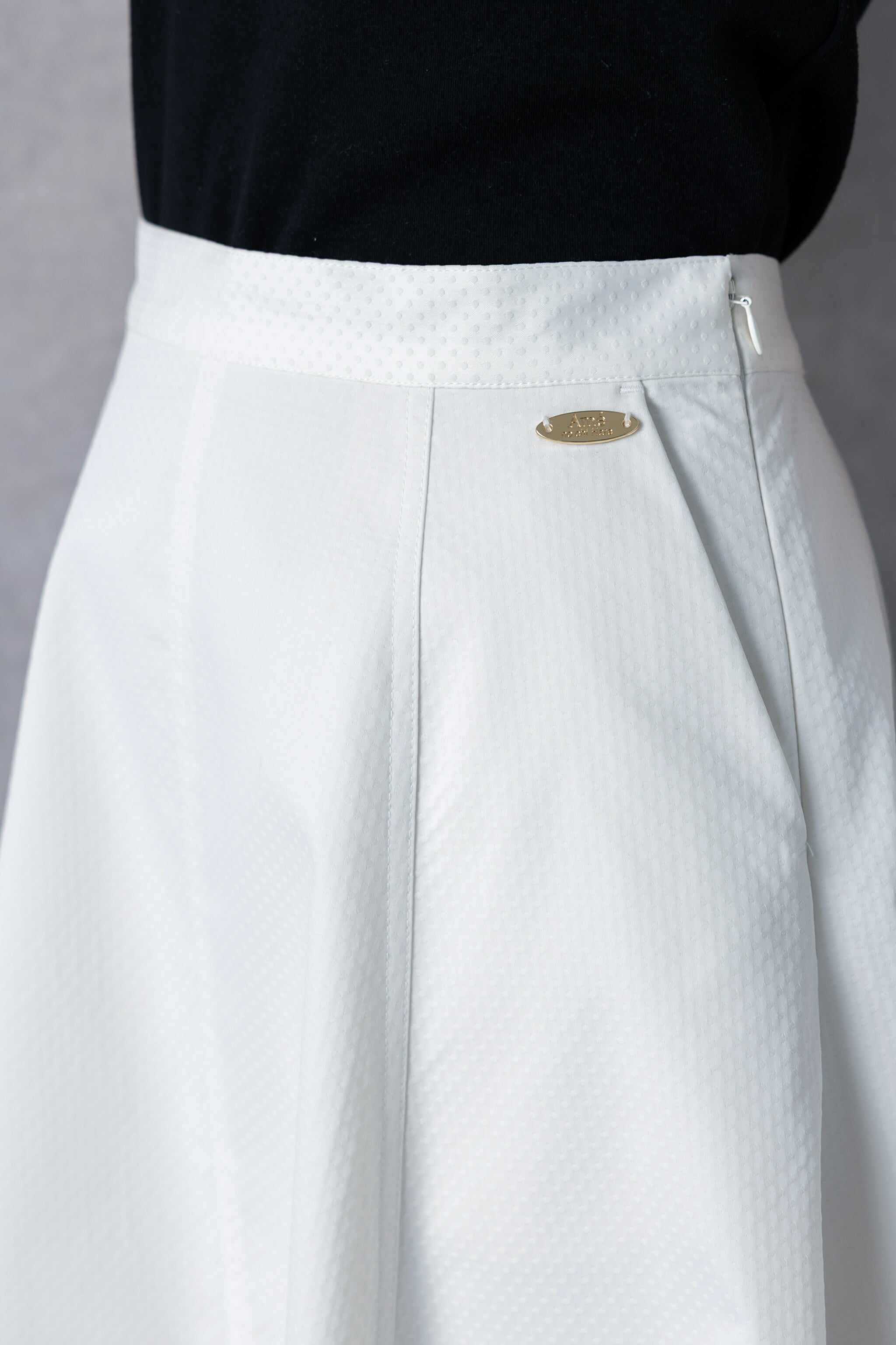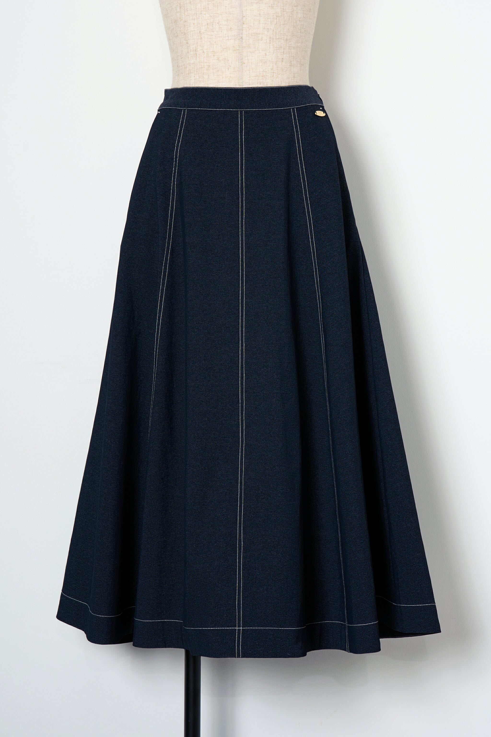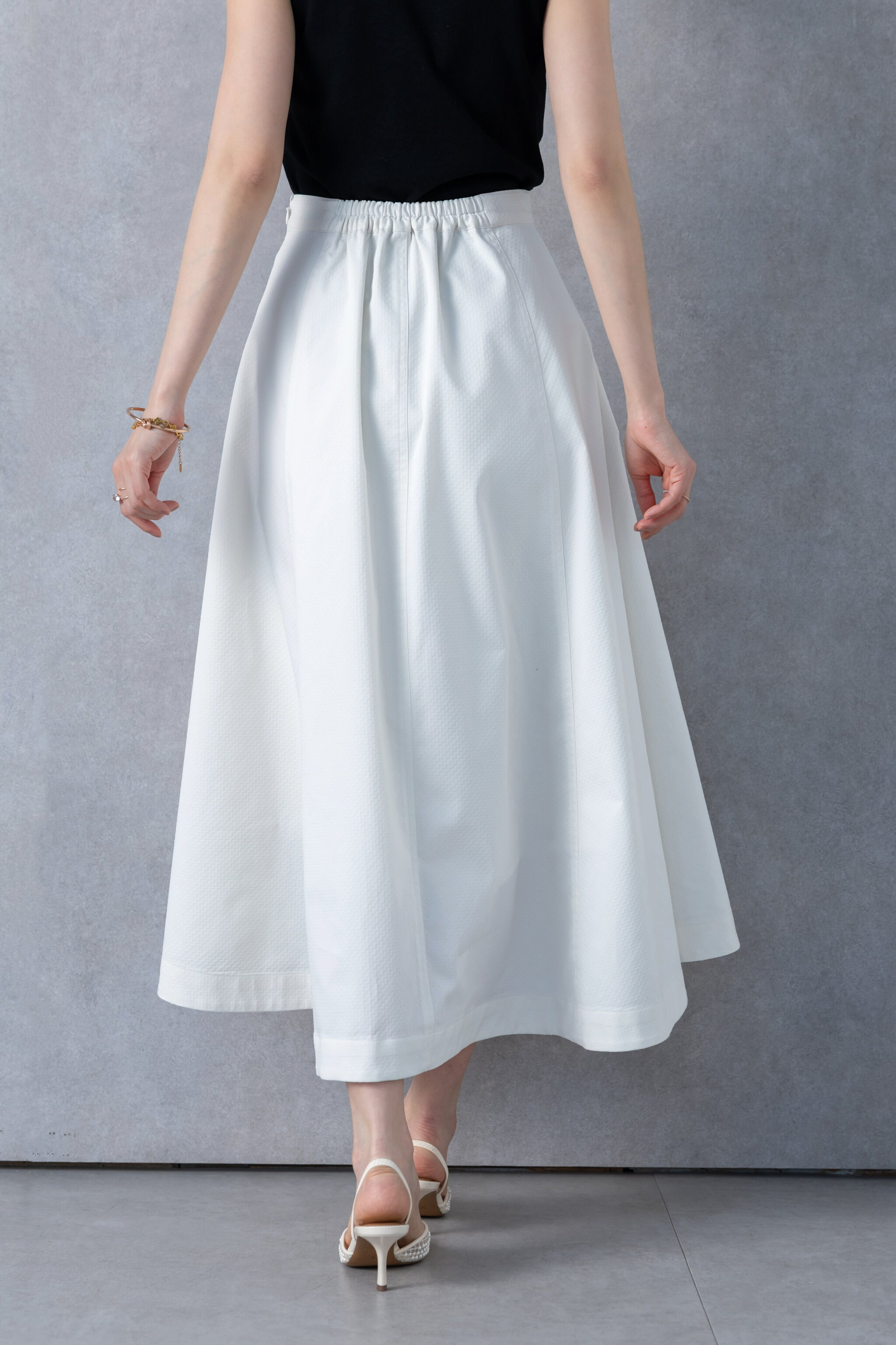 たっぷりとパネル切替を入れ、さらに後ろにかけて流れるように⾧くすることで、裾まわりに美しいフレアを形成したスカート。