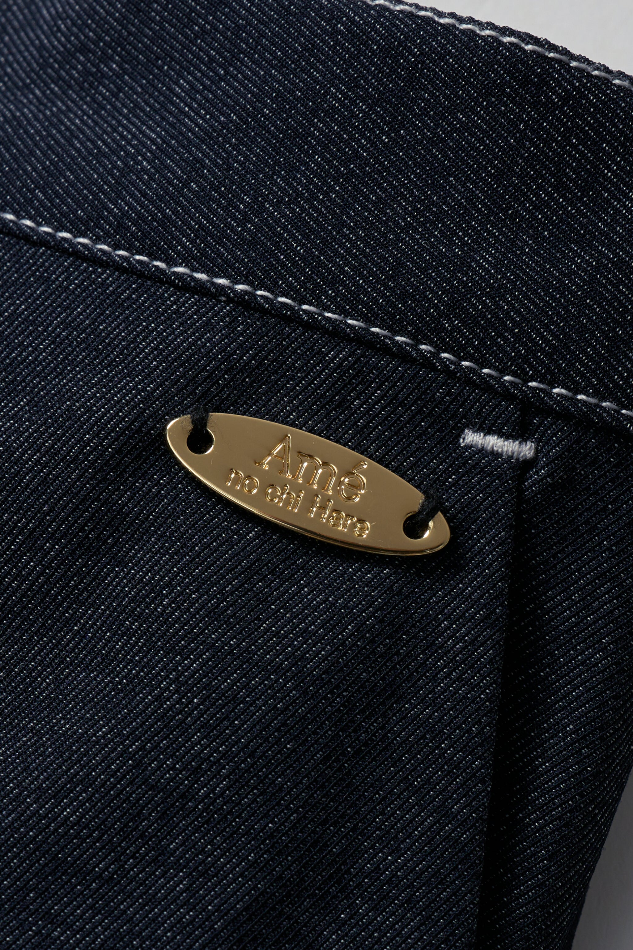 ウエストにはゴールドのロゴプレートをあしらい、トップスインした時さりげないアクセントに。