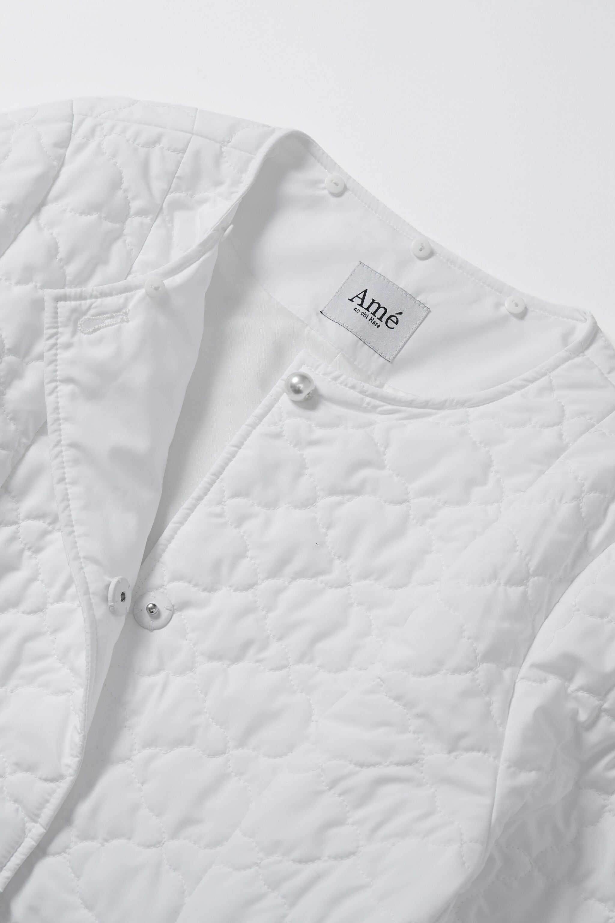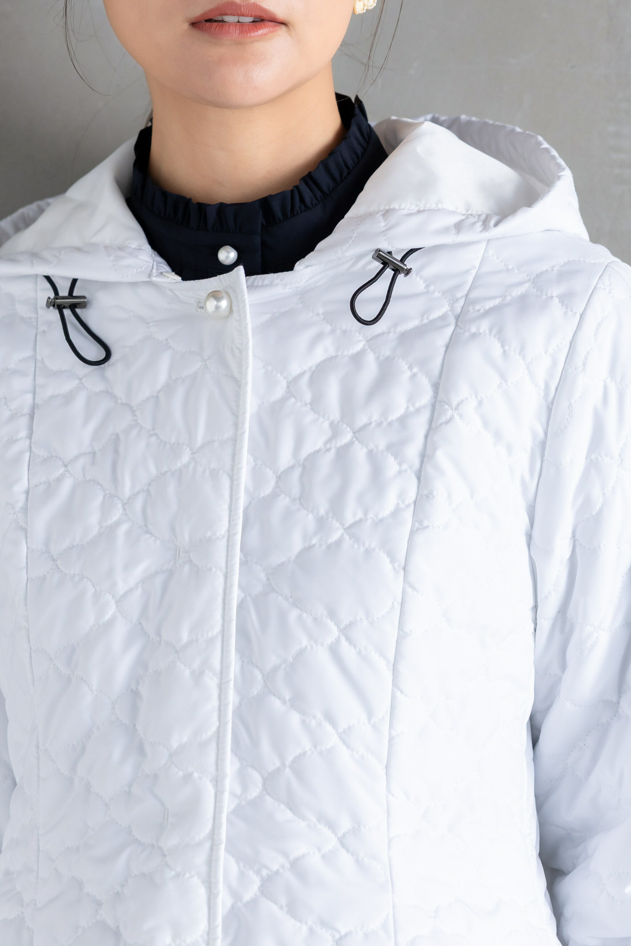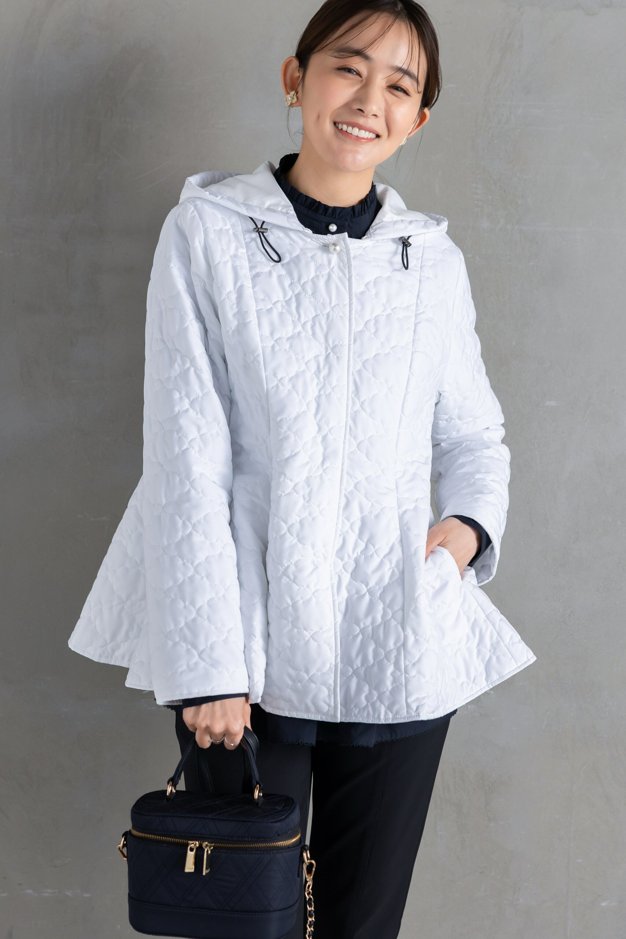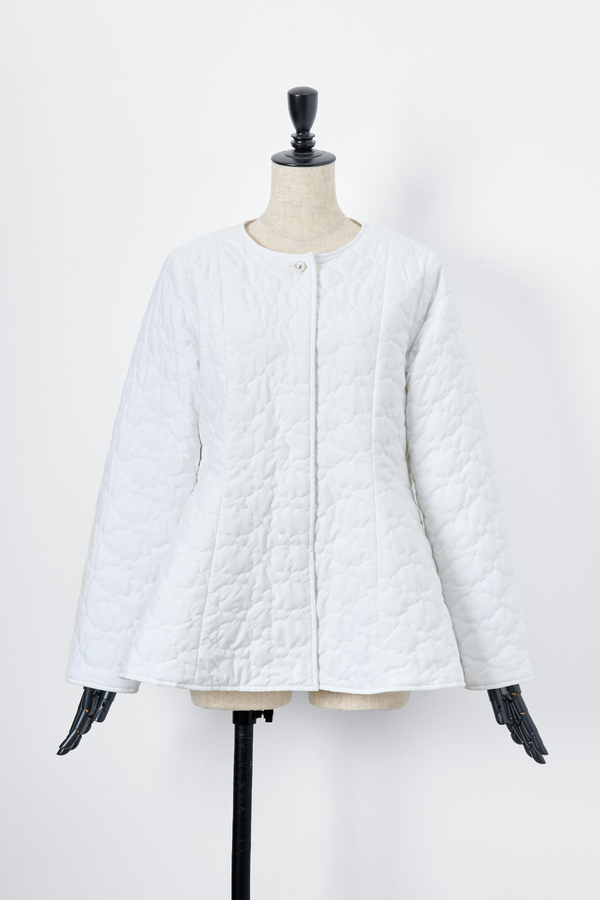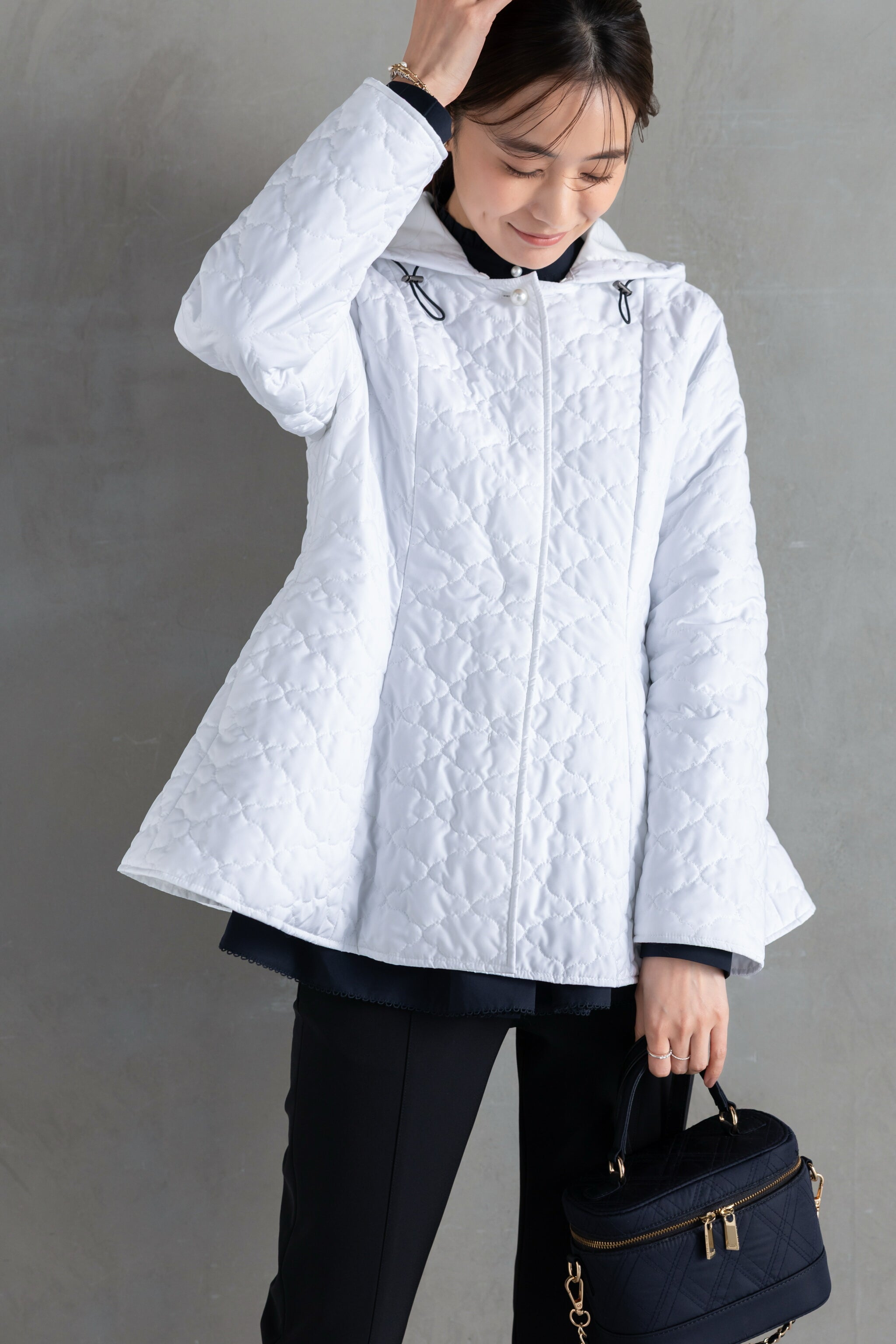 全面に施した雲柄キルティングを主役に、パールボタンを一粒あしらったシンプルデザイン。