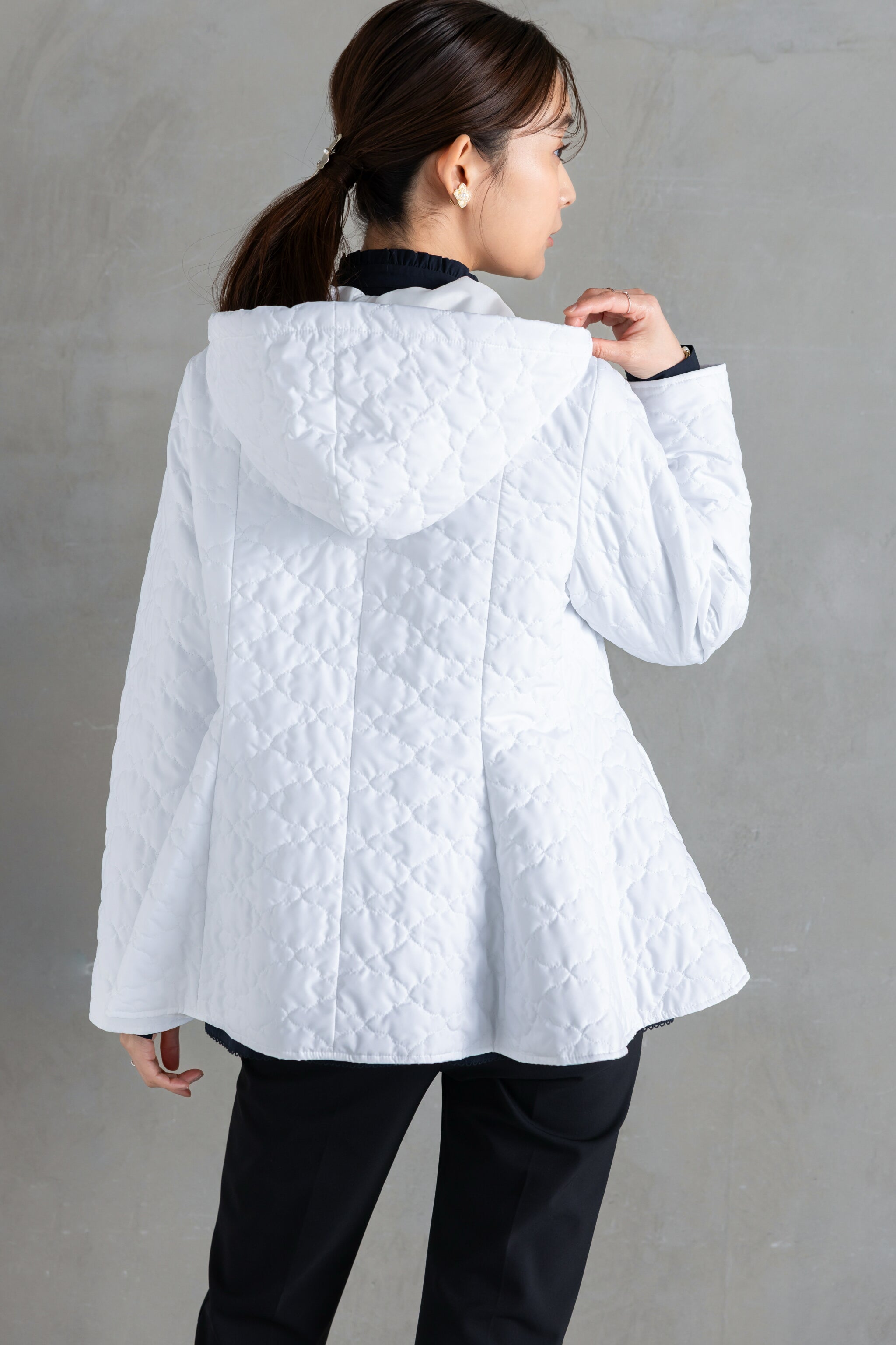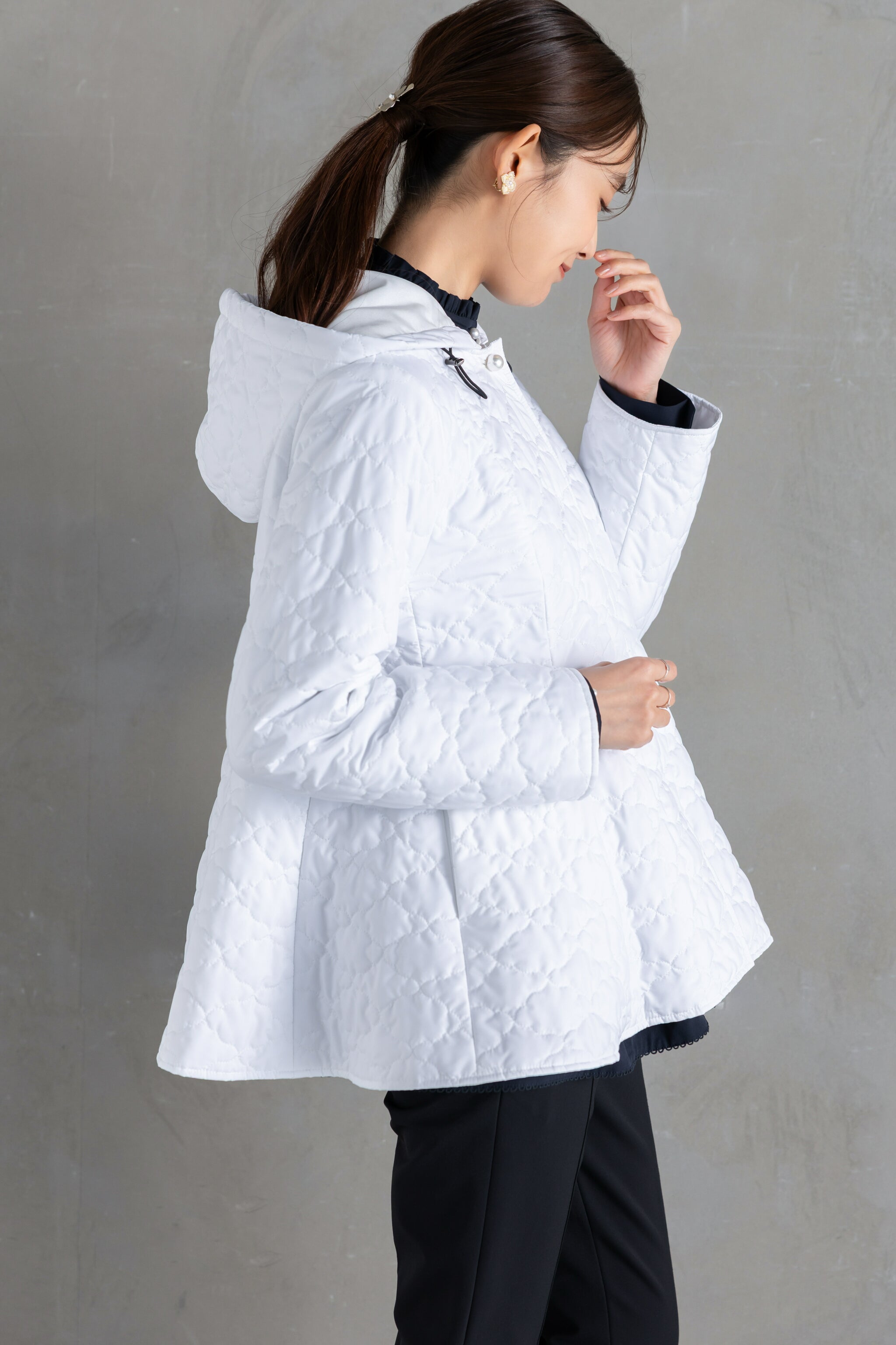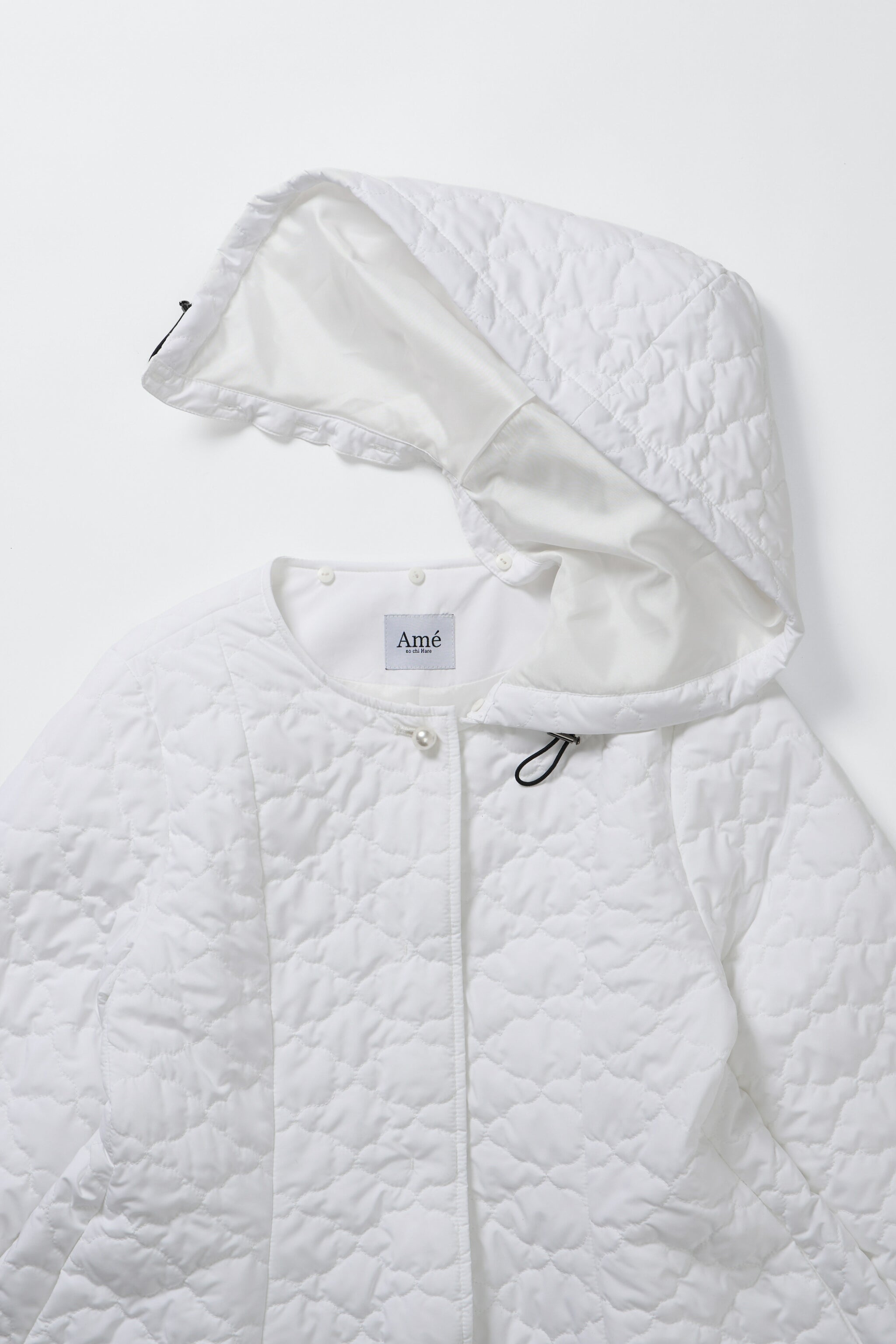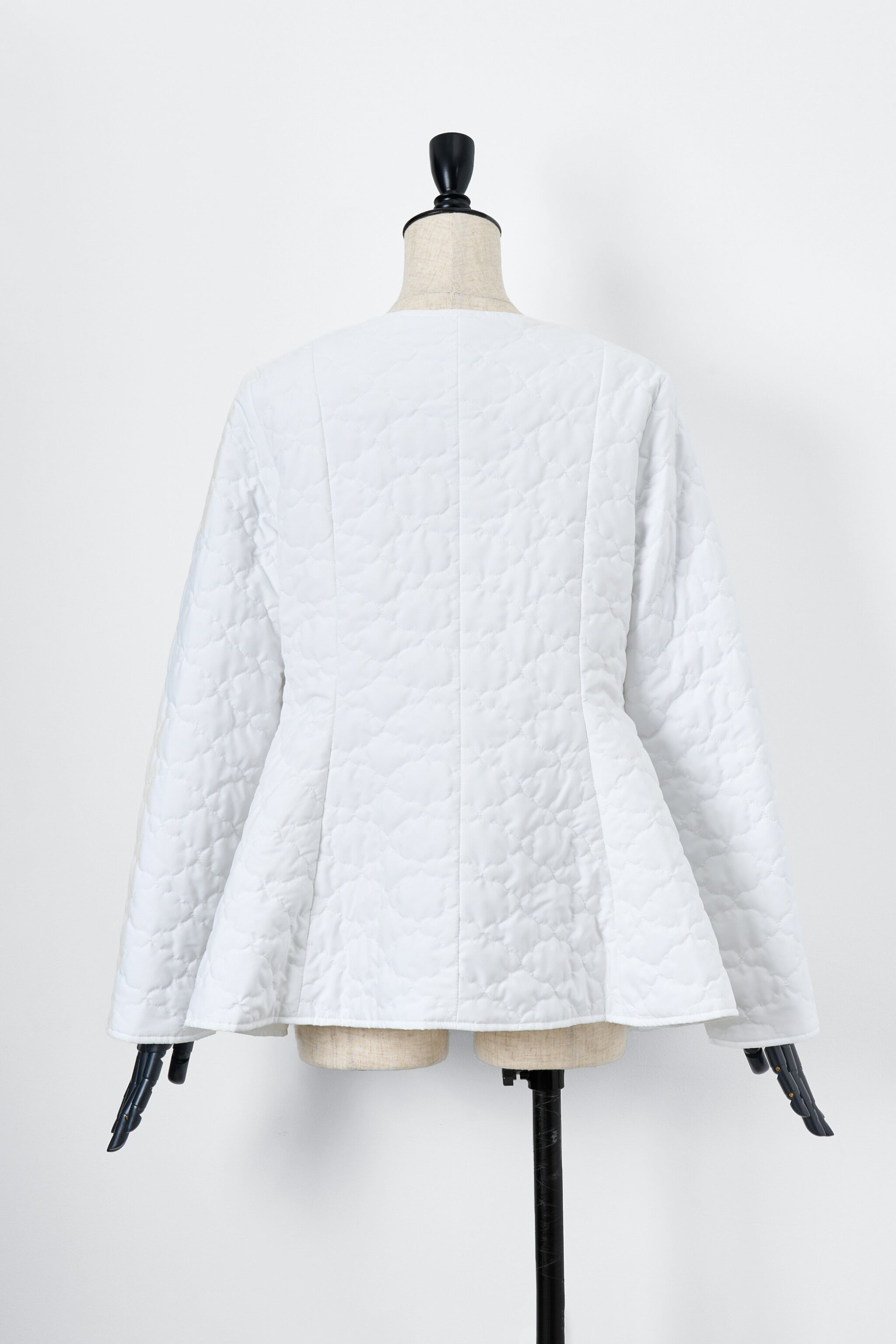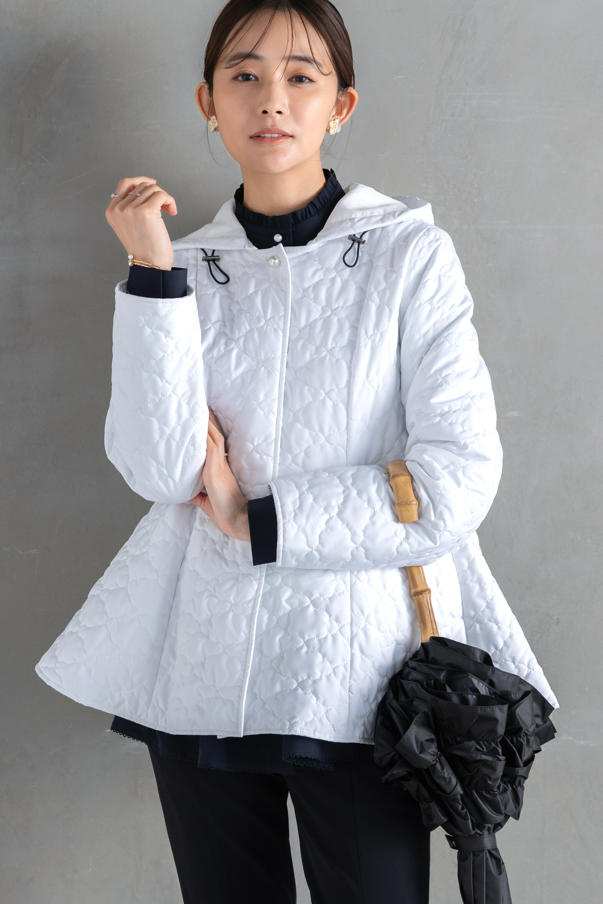 全面に施した雲柄キルティングを主役に、パールボタンを一粒あしらったシンプルデザイン。