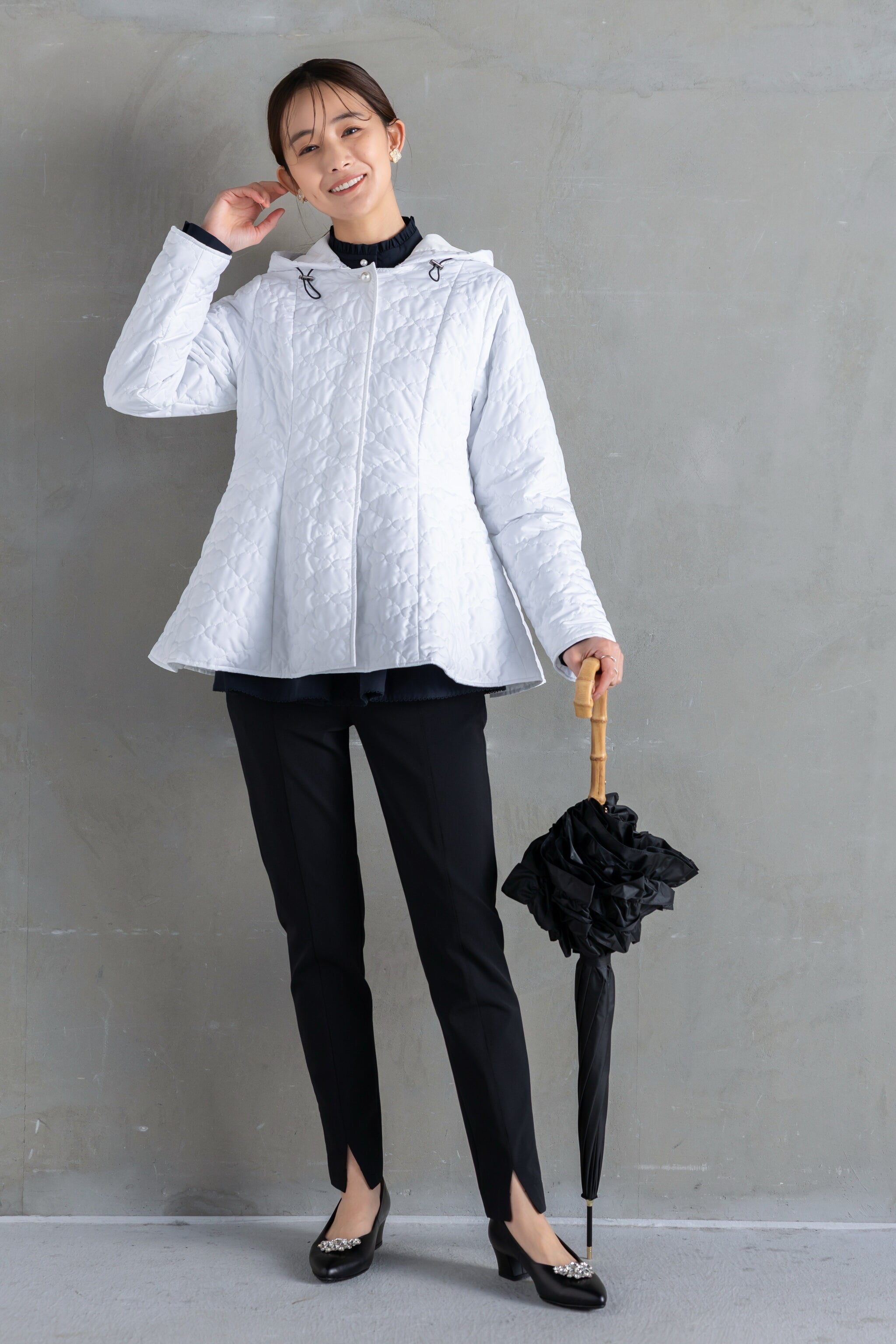 撥水性はもちろんのこと、お食事汚れや花粉も弾くタフな機能性で、ホワイトでも気兼ねなく着用していただけます。