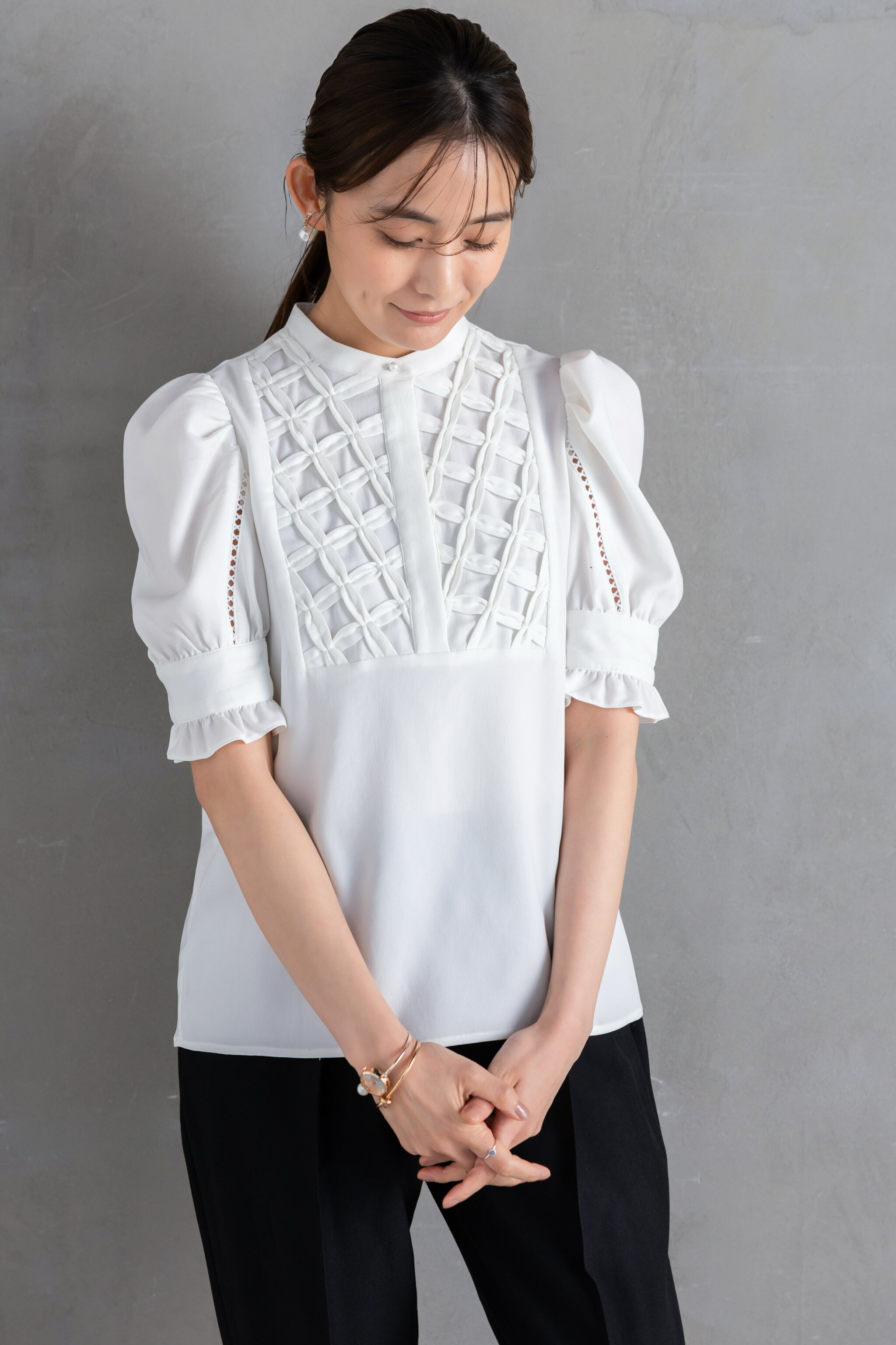 袖には斜めにはしごレースを走らせることで、上品な抜け感、そして二の腕をほっそり魅せるマジックをプラス。