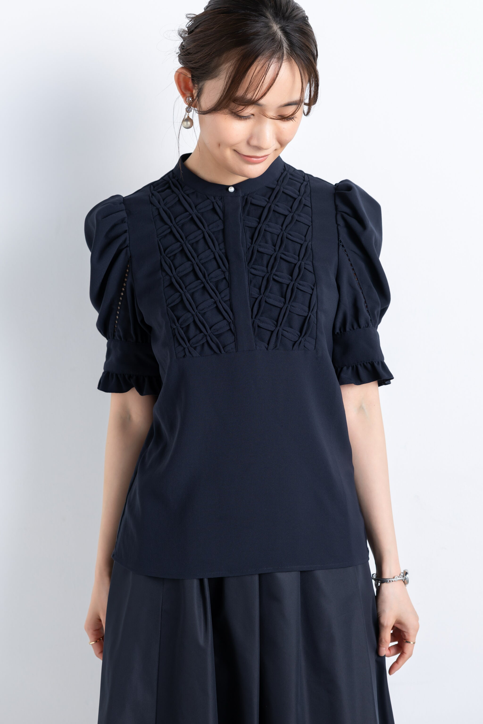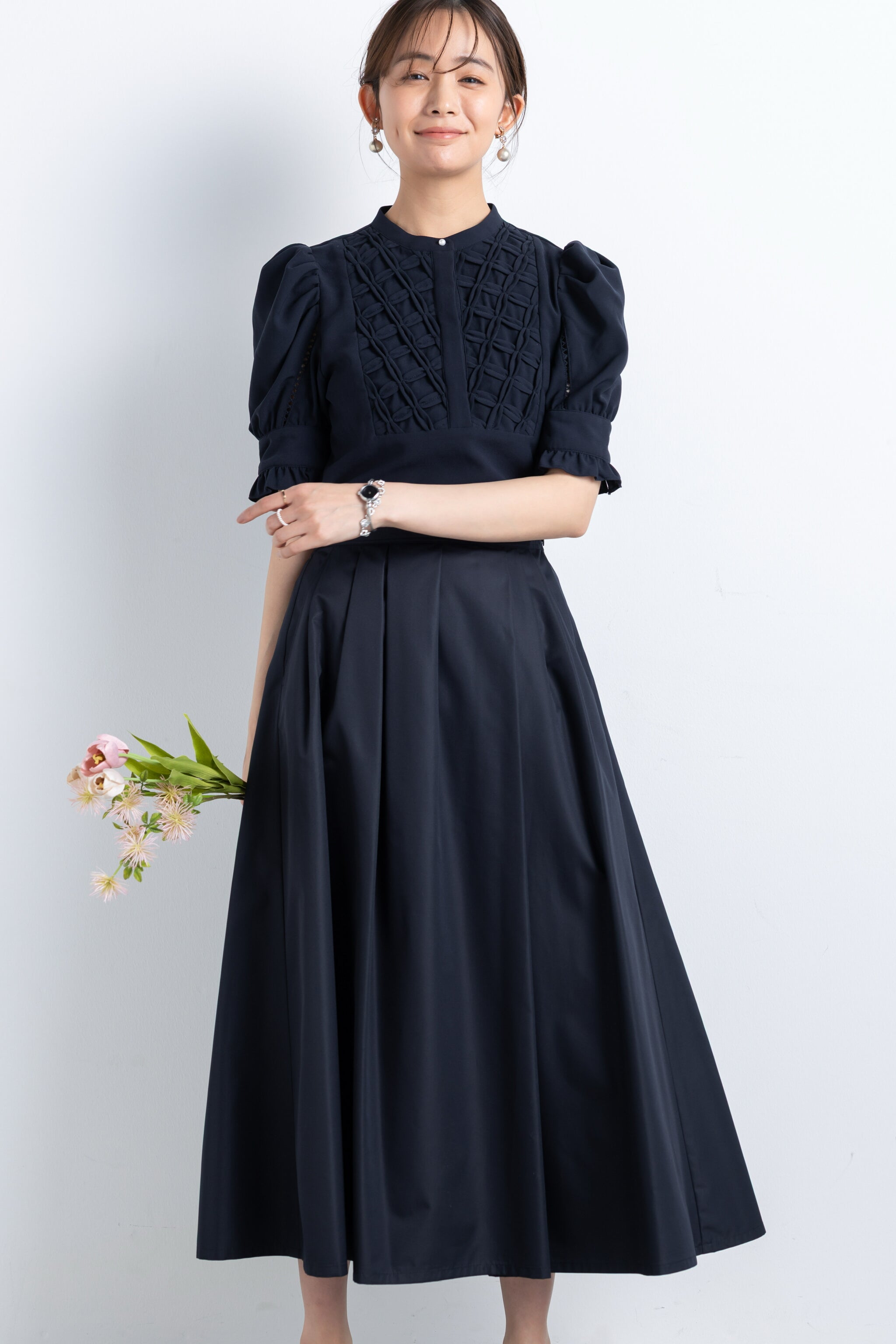 胸元に折り目正しく施したフラワータックが主役のデザイン。