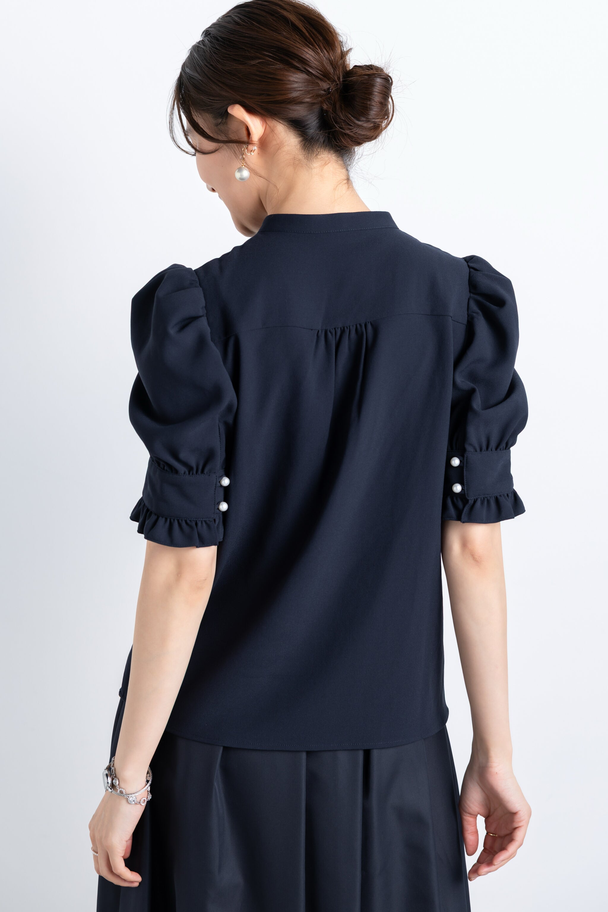 襟元や袖口にはミニパールボタンをトッピングし、優しい印象を底上げしました。