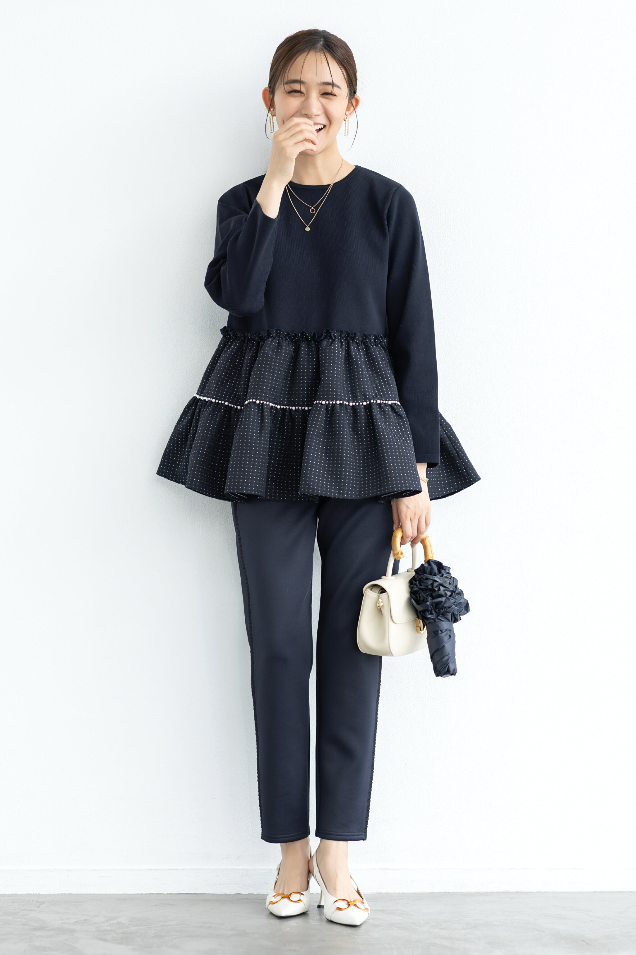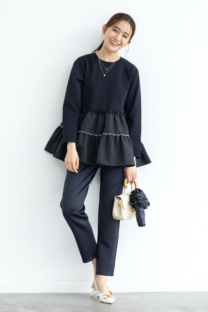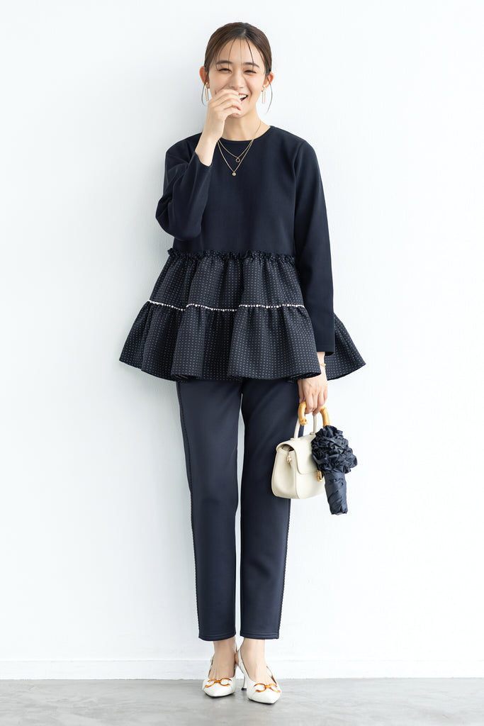 サイドにはブラックのミニフリルをライン状に挟みこむことで、縦のラインを強調。