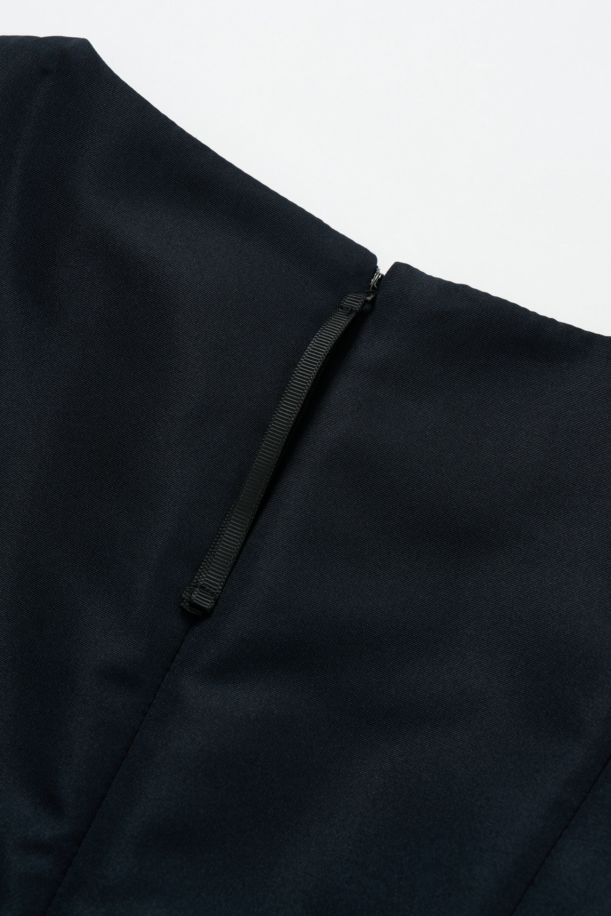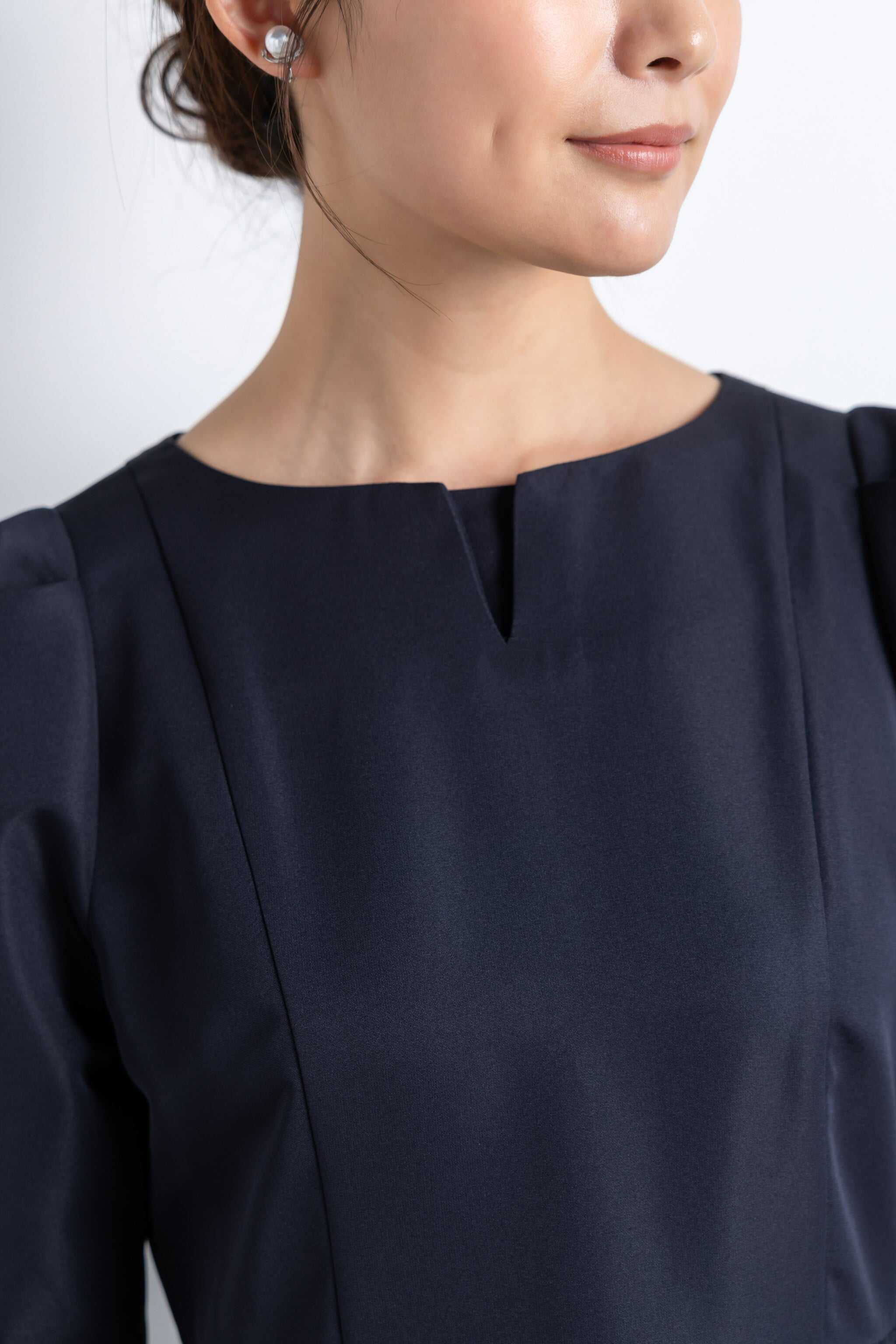 デコルテを可憐に切り取るキーネックは、内側にマチをつけることで肌見せをセーブしています。