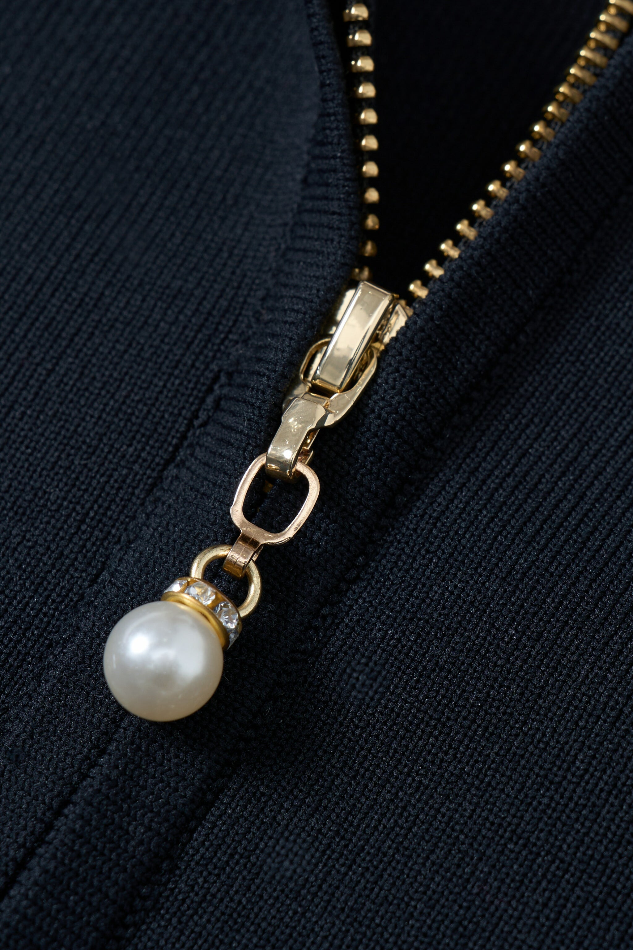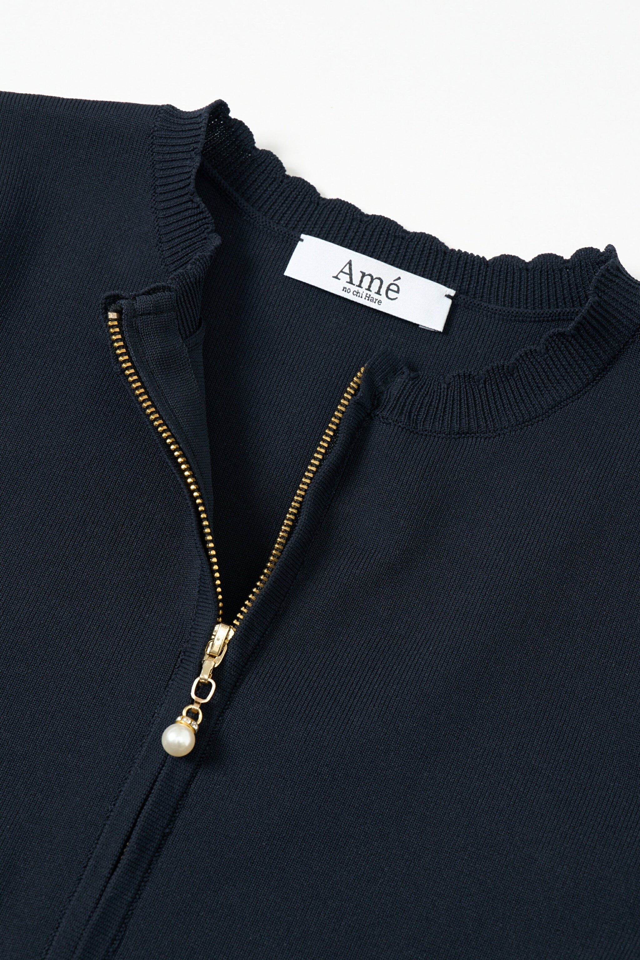 ニットアイテムとしては珍しいフロントファスナー、そしてファスナートップにはパールモチーフが輝きを放ちます。