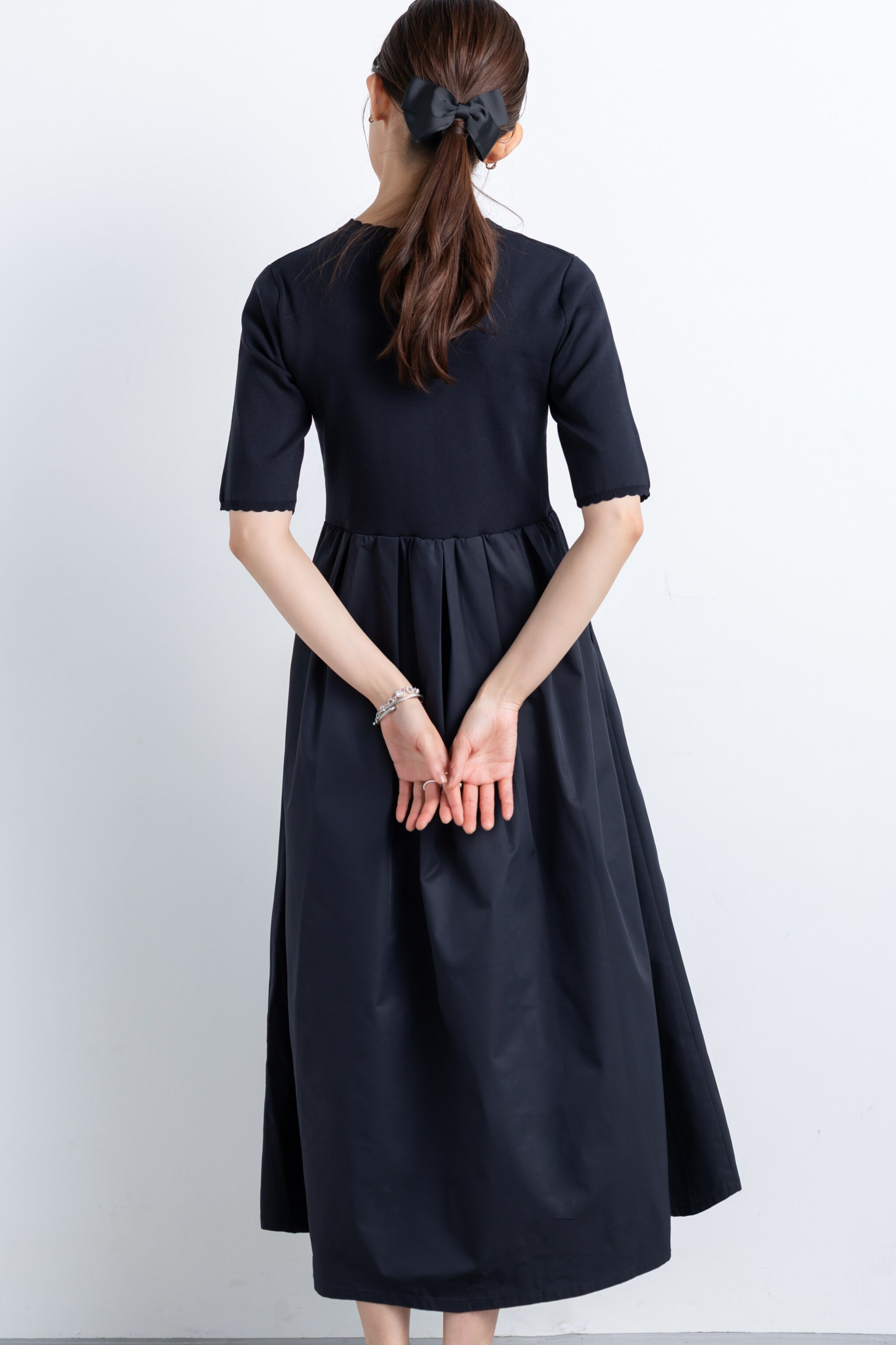 ニット部分はすっきりした目面(めづら)の総針編み、スカート部分はシャカシャカ音が少なく、微光沢のあるエレガントな素材です。