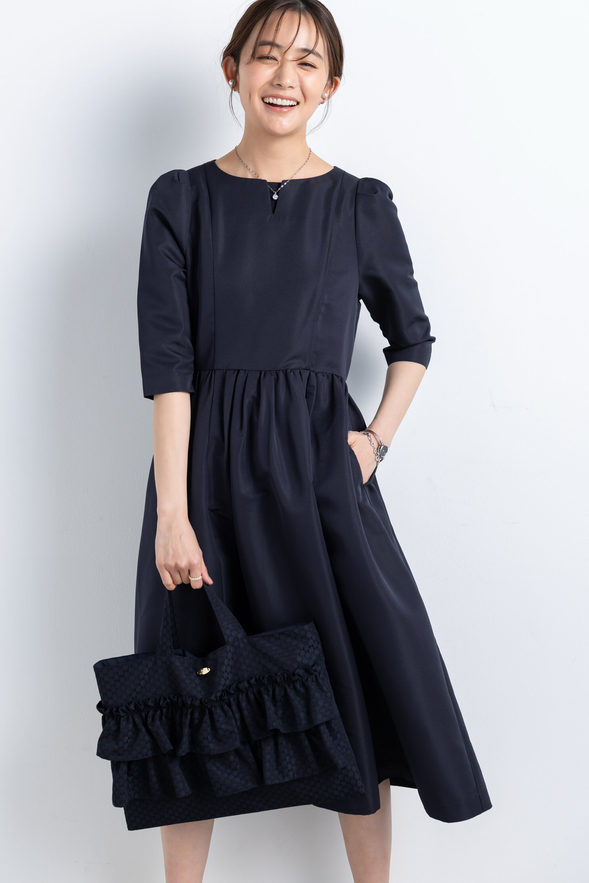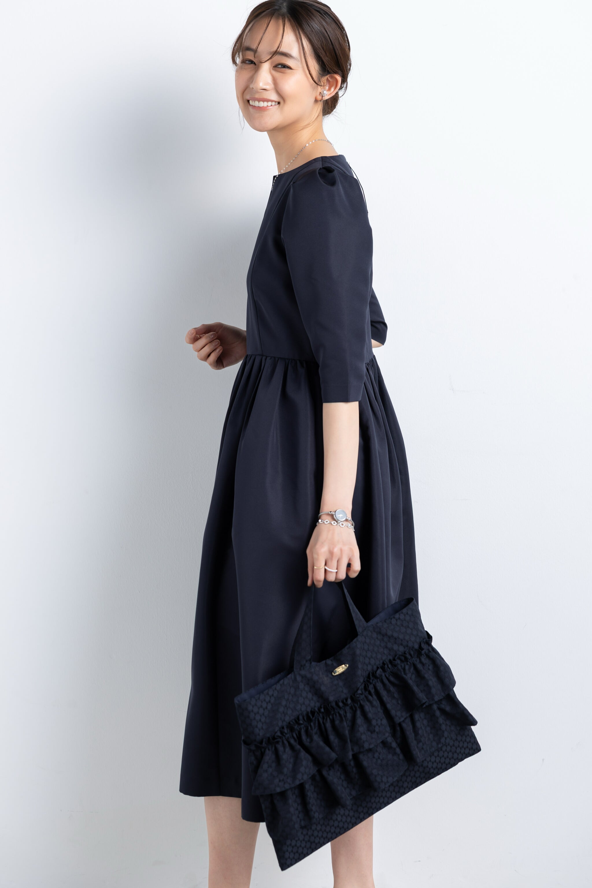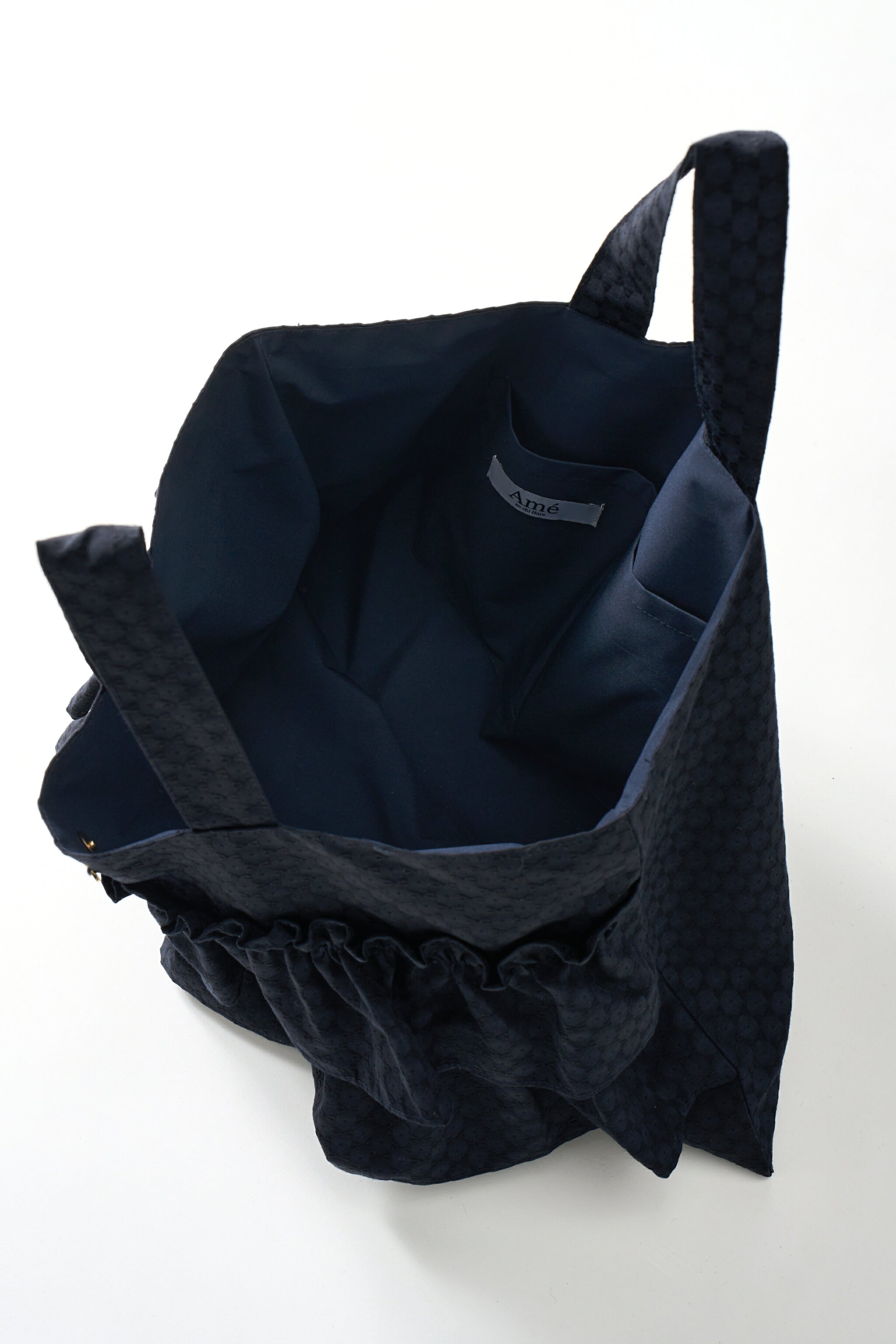 一見ネイビーの無地のように見えますが、よく見ると同色のミニリボン柄が隠れた大人可愛いバッグです。